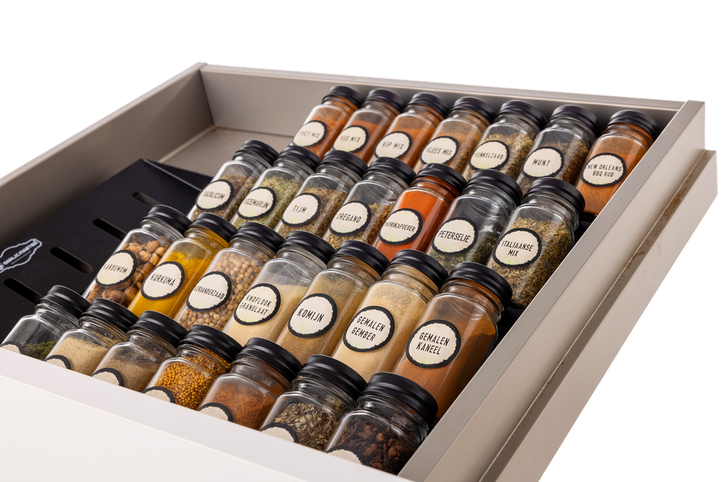 ✅ Inclusief luxe metalen tray – Houd je kruiden overzichtelijk en stijlvol opgeborgen in je keukenlade.